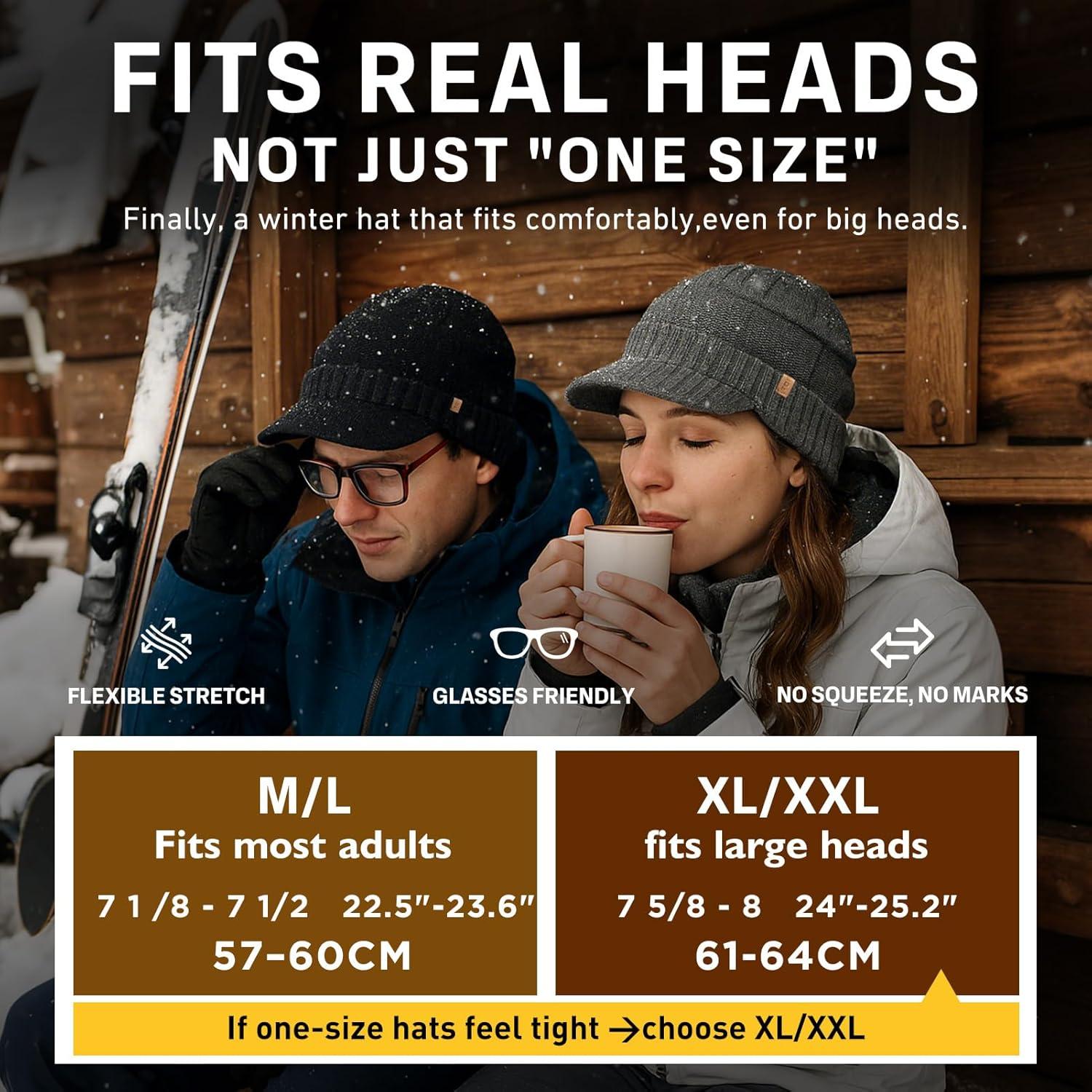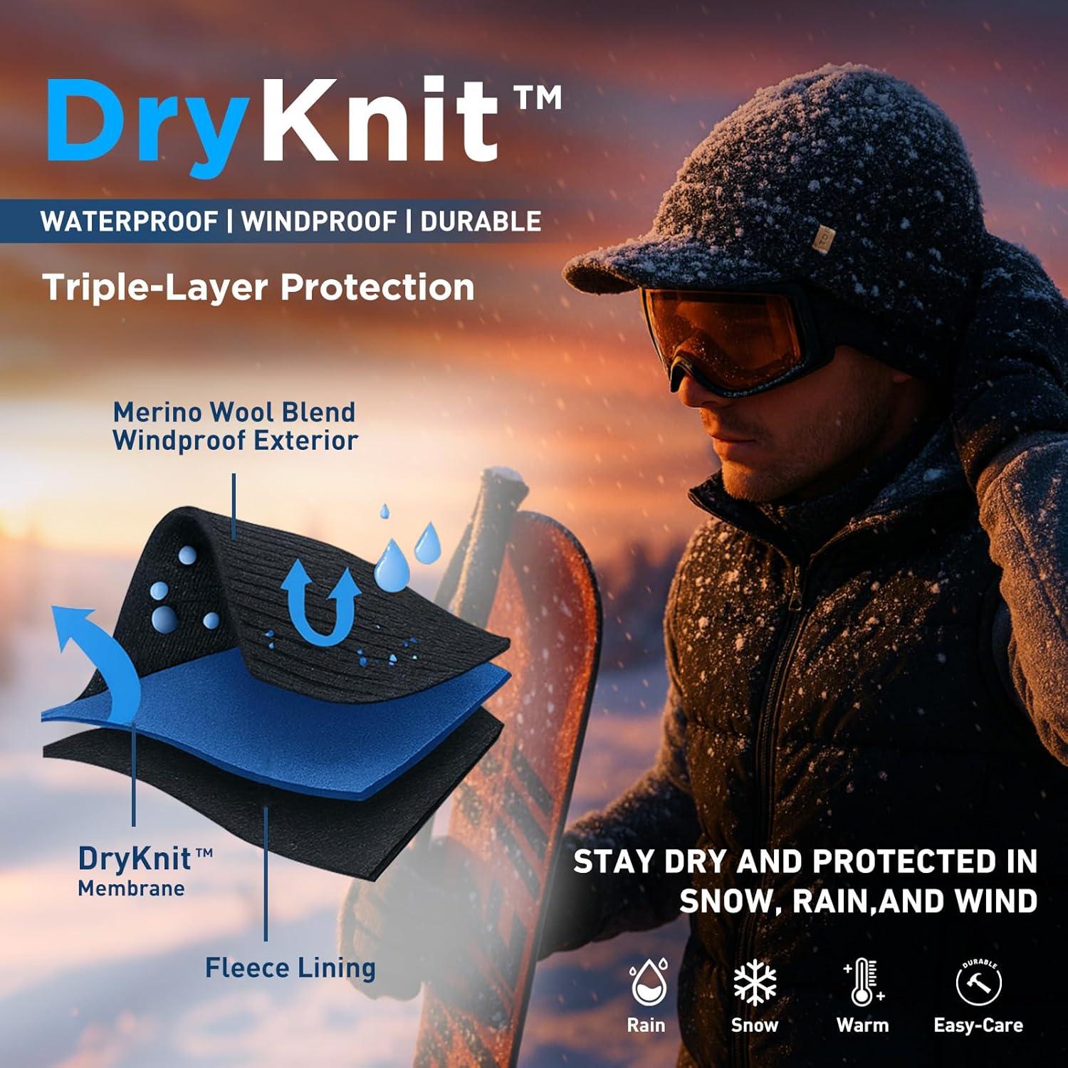 Stay warm, dry, and protected in the harshest winter weather with the TOP-EX DryKnit Waterproof Fleece Lined Beanie with Brim. Crafted from a premium wool blend (40% Polyester / 20% Merino Wool / 20% Nylon / 20% Acrylic), this cap combines the natural insulation of Merino wool with the durability and easy-care performance of synthetics. Unlike traditional wool hats, this one is machine washable, so you can wear it daily without worry. The DryKnit waterproof & windproof membrane blocks rain, snow, and cold gusts while remaining breathable—perfect for skiing, hiking, hunting, golfing, fishing, running, or daily winter commuting. The fleece lining offers itch-free comfort and locks in warmth around your head and ears. Its integrated knit brim isn’t just for style—it keeps snow and rain off your face, prevents glasses from fogging, and improves visibility in extreme weather. Combined with the oversized fit (available in M/L (US 7⅛–7½│57–60cm│22.5–23.6″inches) and XL/XXL (US 7⅝–8│61–64cm│24–25.2″inches), this beanie solves the problem of “one-size-fits-too-tight” hats. With its combination of functionality, fashion, and comfort, the TOP-EX beanie makes not only an essential piece of outdoor winter gear, but also a perfect holiday or birthday gift for anyone who values warmth, style, and performance.