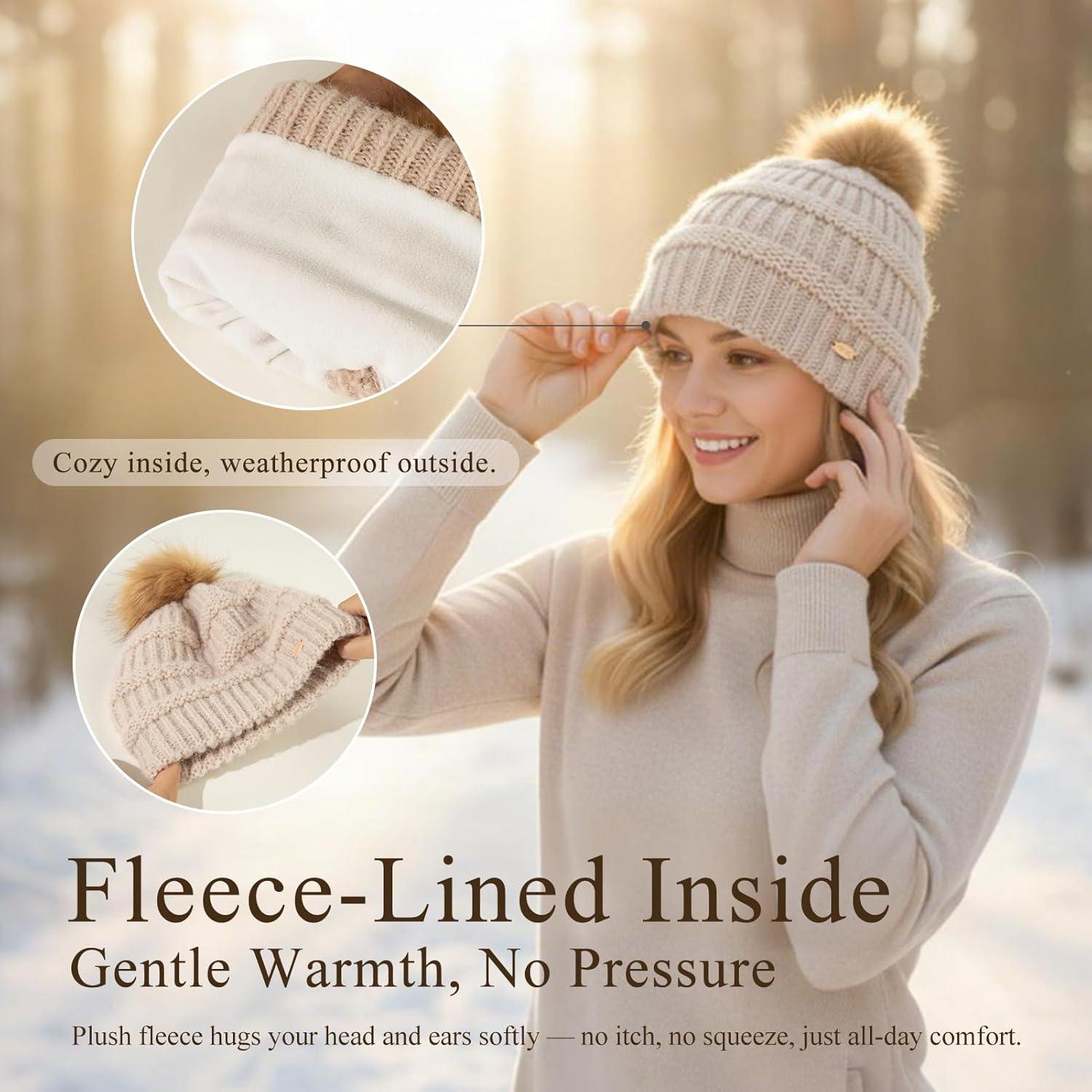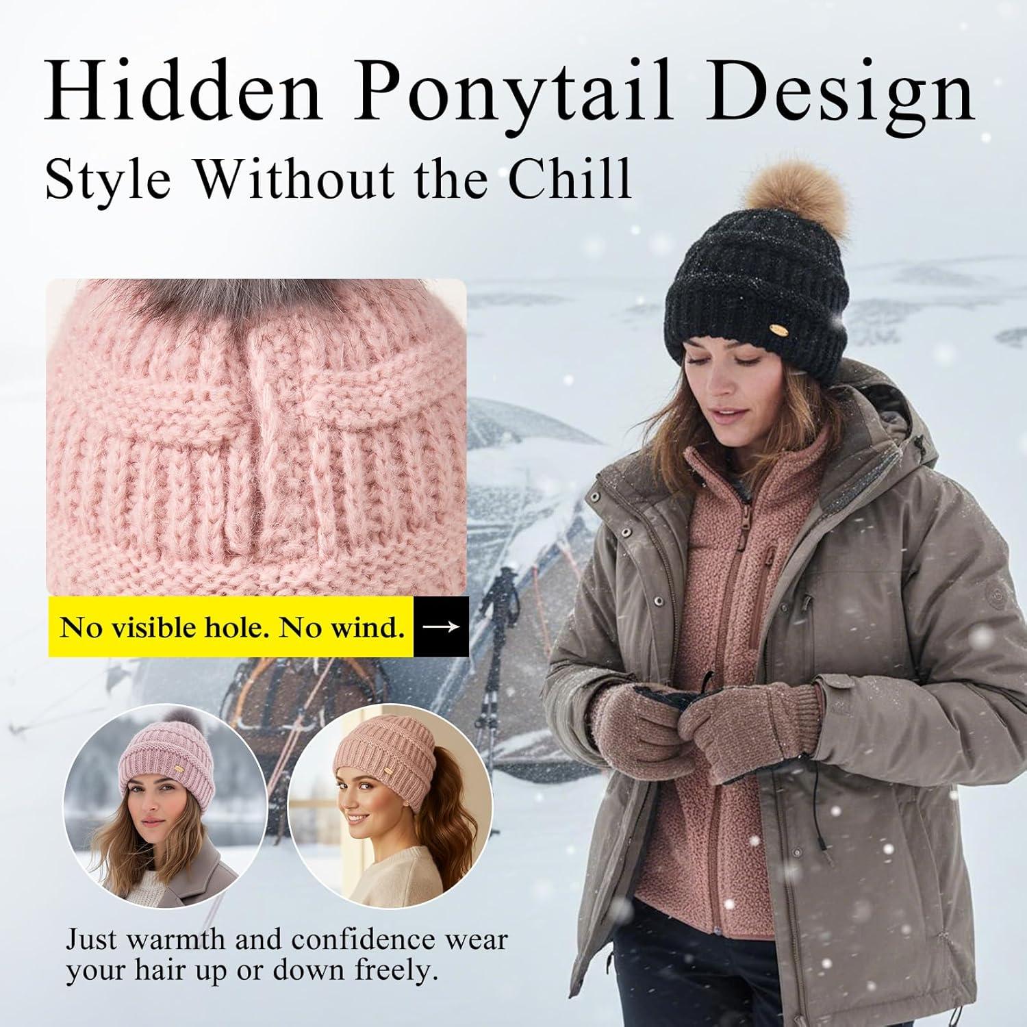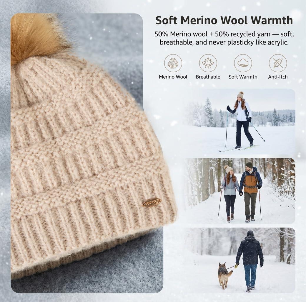 TOP-EX ChicPony™ Winter Hat for Women Fleece Lined 50% Merino Wool Beanie with Hidden Ponytail Hole & Detachable Faux Fur Pom(Oatmeal Beige+box)