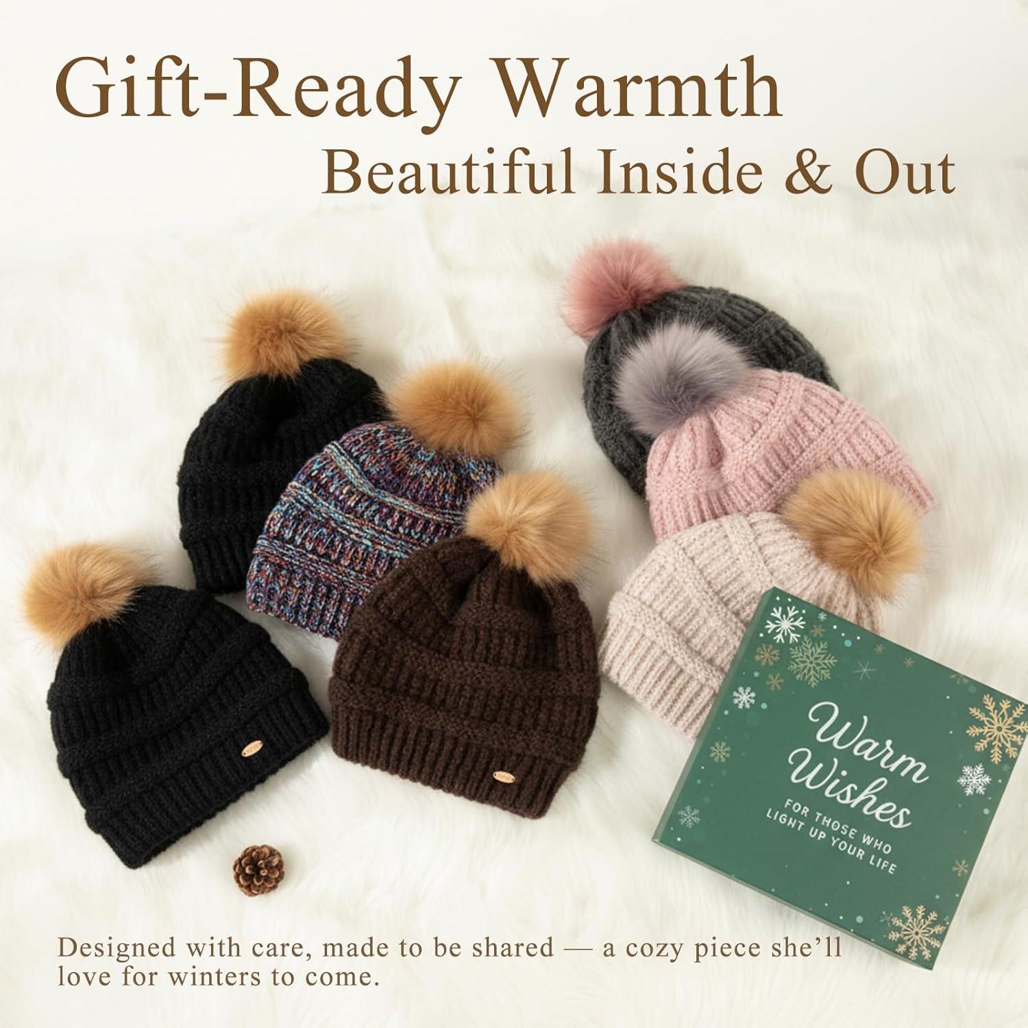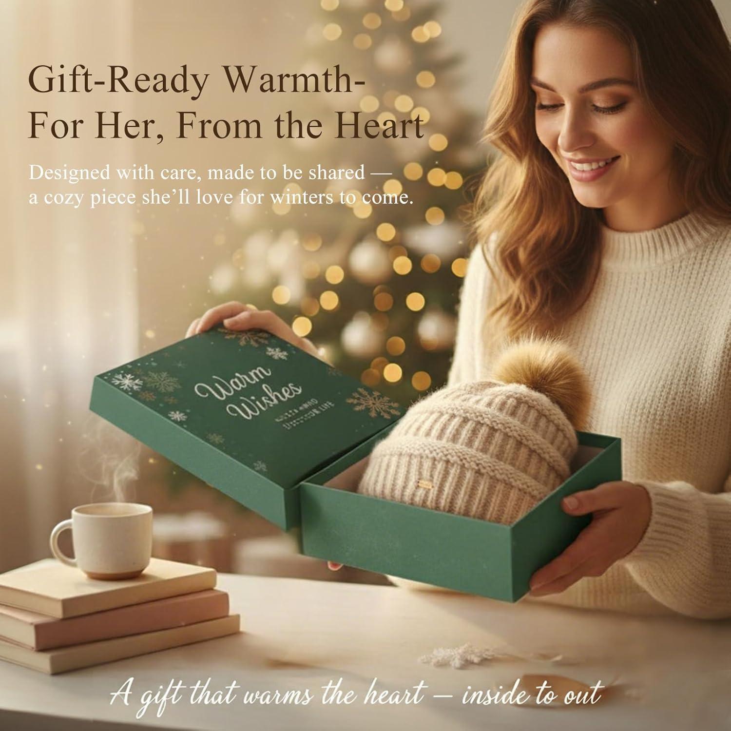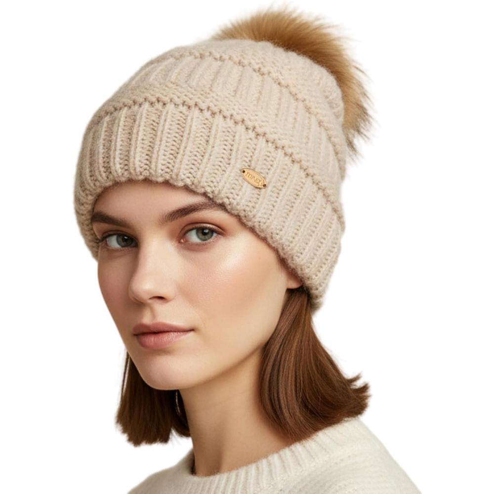 TOP-EX ChicPony™ Winter Hat for Women Fleece Lined 50% Merino Wool Beanie with Hidden Ponytail Hole & Detachable Faux Fur Pom(Oatmeal Beige+box)