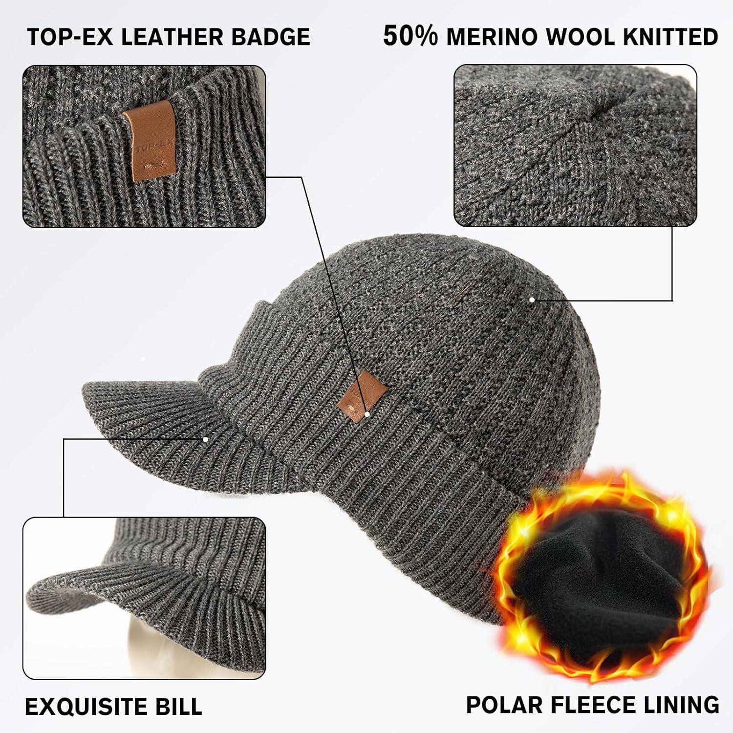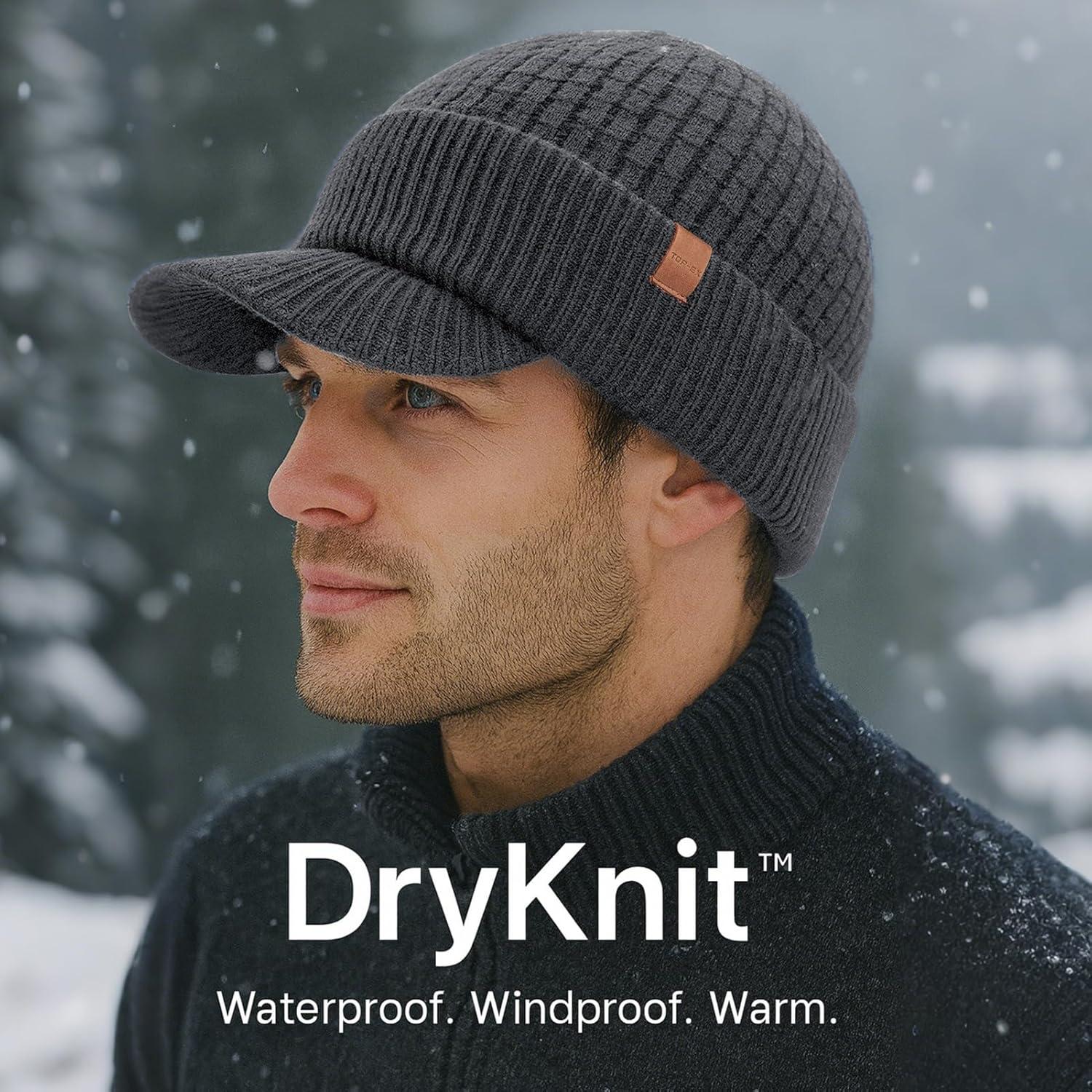 TOP-EX DryKnit™ Waterproof 50% Merino Wool Visor Beanie Hat for Men Fleece Lined Winter Hat with Brim for Big Heads(#6 Black (Waterproof))