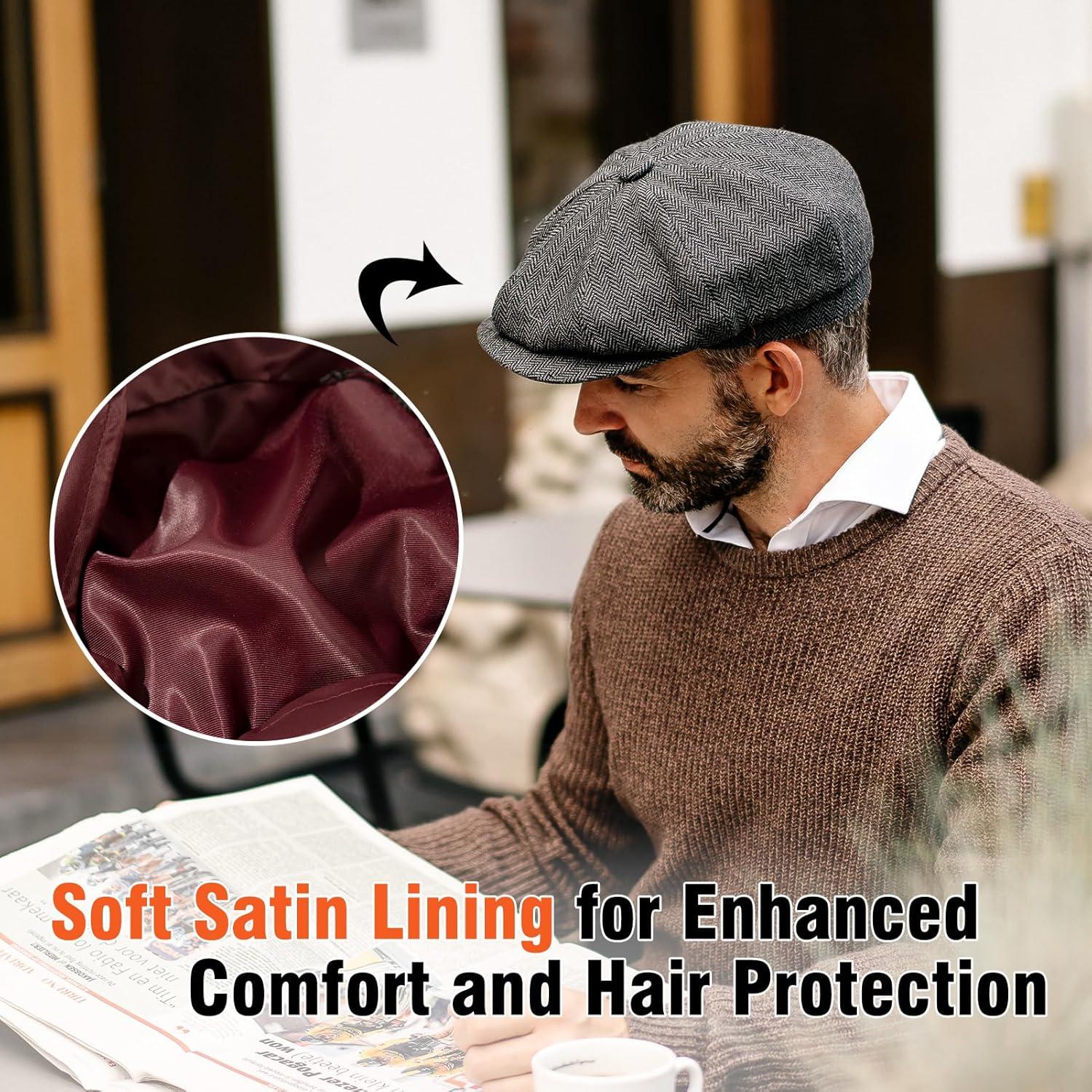 Introducing our 55% merino wool 8-panel newsboy flat cap, designed with a classic Gatsby Ivy style that’s perfect for winter. This cap features a soft Satin Lining providing a smooth and luxurious feel, reducing friction to protect your hair from damage and ensuring all-day comfort. Available in sizes L (57-59cm), XL (60-62cm), and XXL (63-65cm), it includes an adjustable string for a customizable fit. Whether you’re on the golf course, out for a winter walk, or adding a touch of vintage sophistication to your outfit, this cap combines style, functionality, and comfort to keep you cozy all season long.