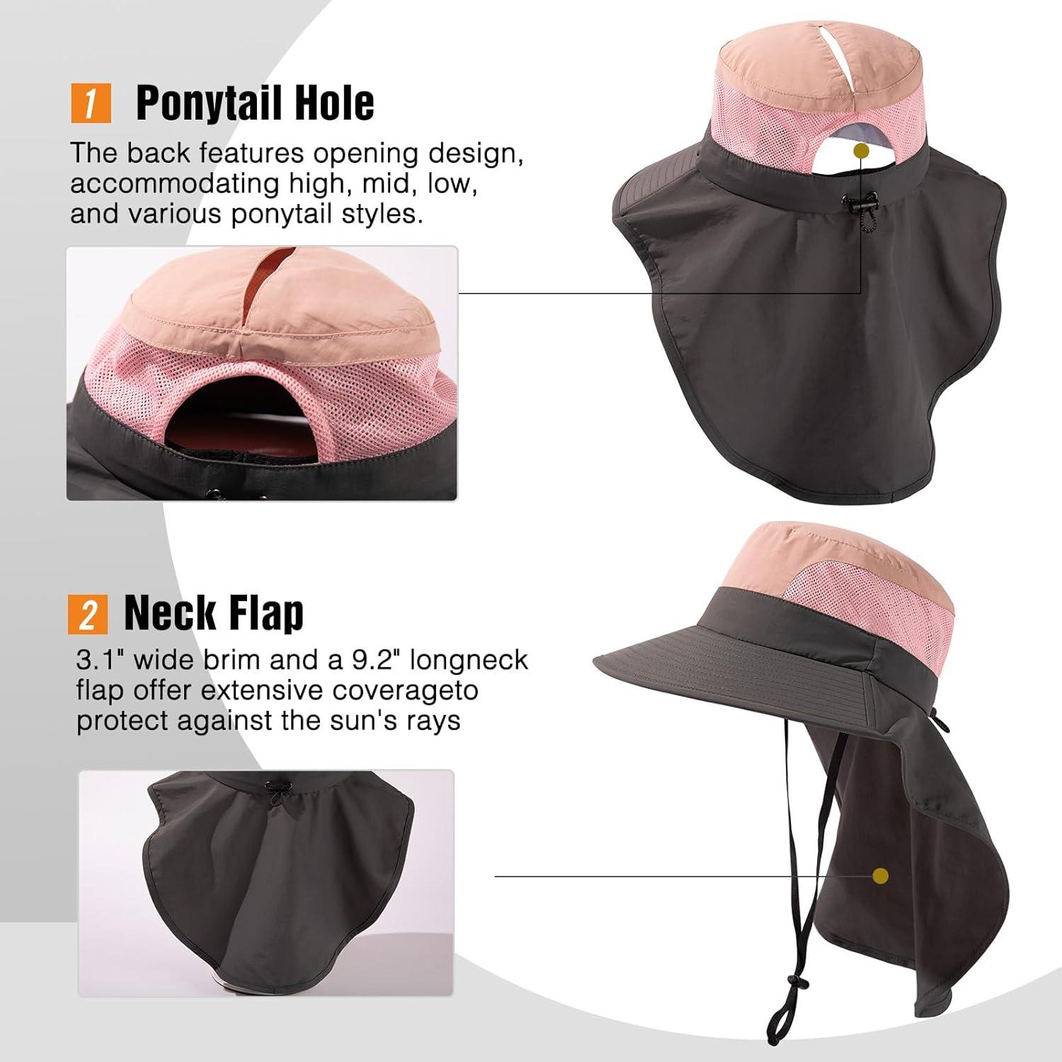 Women's Flap Ponytail UV 50 Packable Mesh Sun Fishing Beach Hiking Oversized XL XXL Hat(Pink)